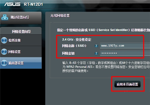 5)设置这台华硕路由器上的无线名称、无线密码,然后点击“应用本页面设置”。